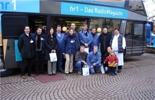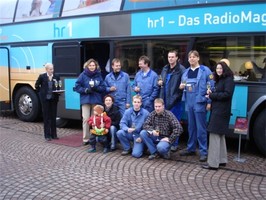 hr1 kam an dieser Bewerbung, plus Beschreibung des Schlitzerlandes und des tollen abwechslungsreichen Speiseplanes der Mitarbeiter der Firma "Peiker und Heil " einfach nicht vorbei und schickte am Mittwoch einen riesigen Doppeldecker-Bus mit Bordküche von Schuy-Reisen nach Schlitz auf den Hof der alten Dieffenbach-Schule.